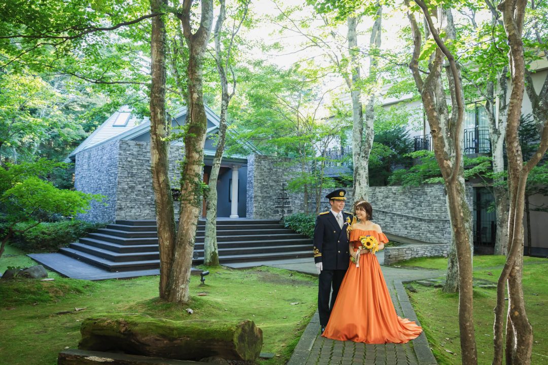 ワンちゃんもお手伝いしてくれた心温まる挙式の後は、軽井沢の原風景を残す中庭で、ゲストと今日この日を迎えられたことに乾杯。披露宴では大切なゲストの方が代表で、おふたりの祝福を祈って乾杯。結びにゲストの皆様の幸せを祈って全員で乾杯。これからも一緒に乾杯が出来るよう、親御様にはグラスを、ゲスト全員にはテーマデザインのコースターをお渡ししました。ゲストとおふたりらしさで通じ合った楽しい一日をお過ごしいただきました。