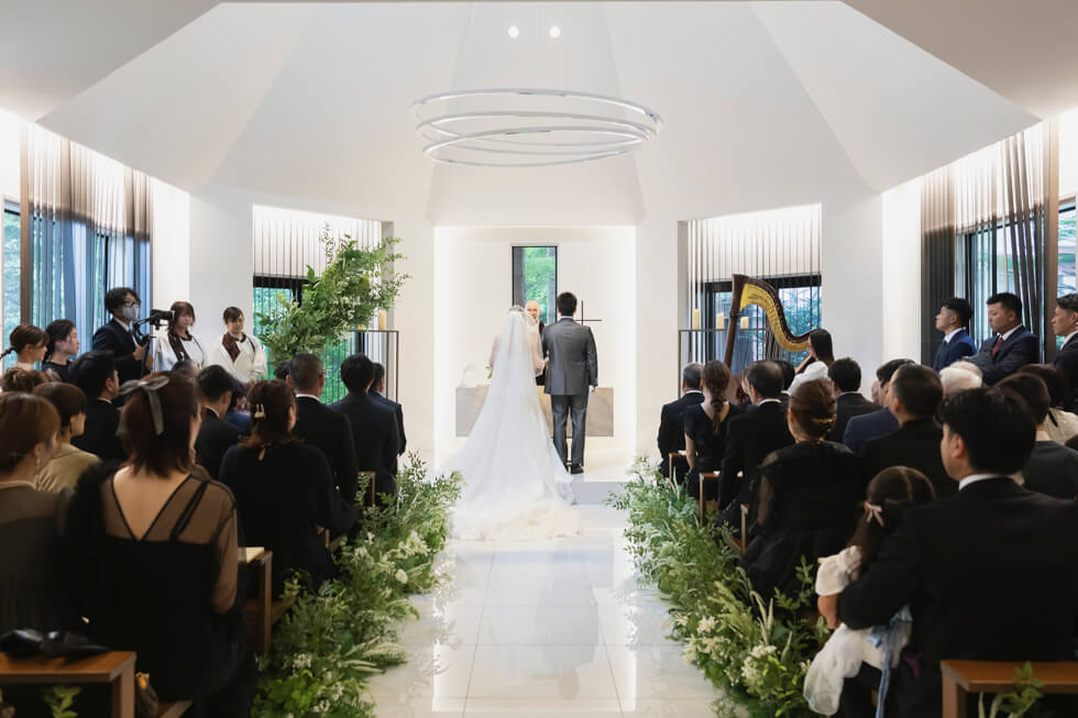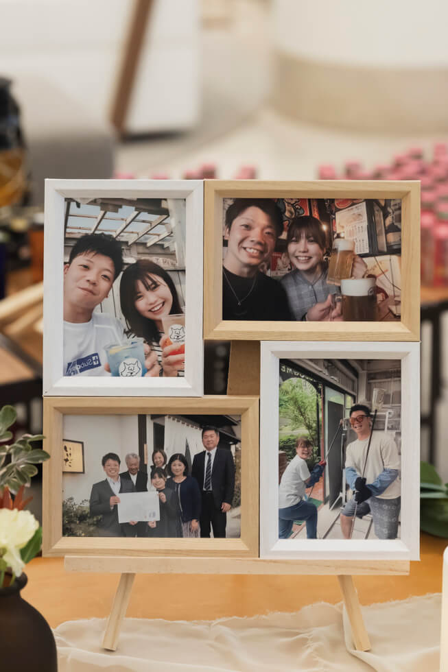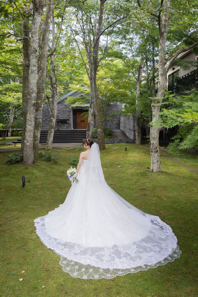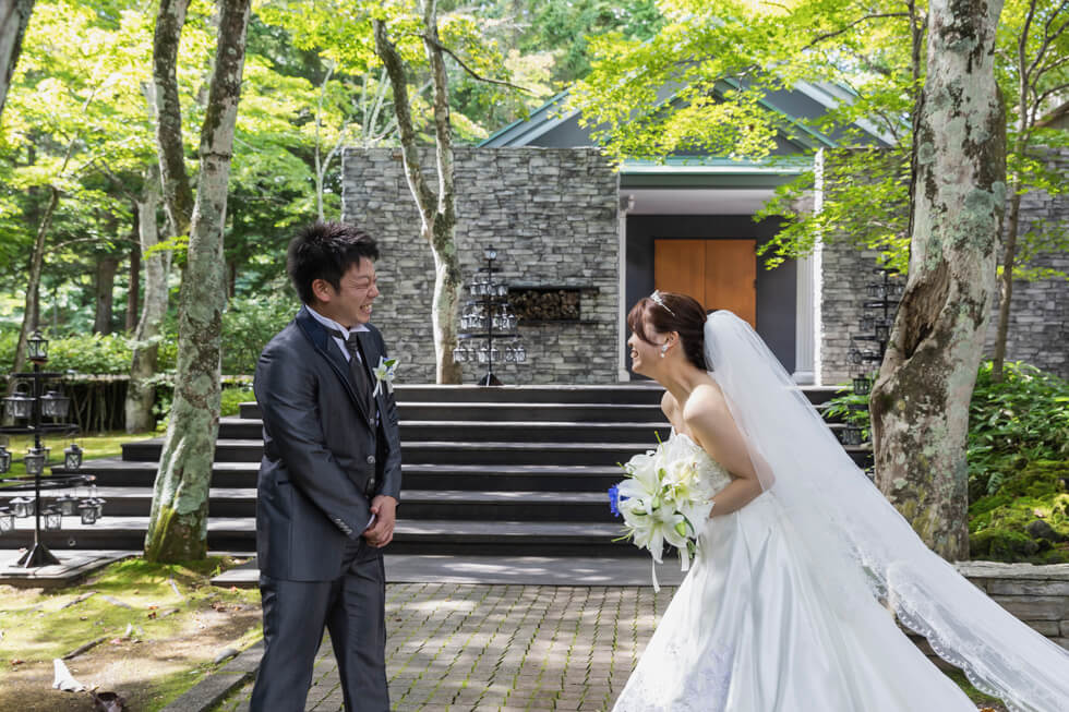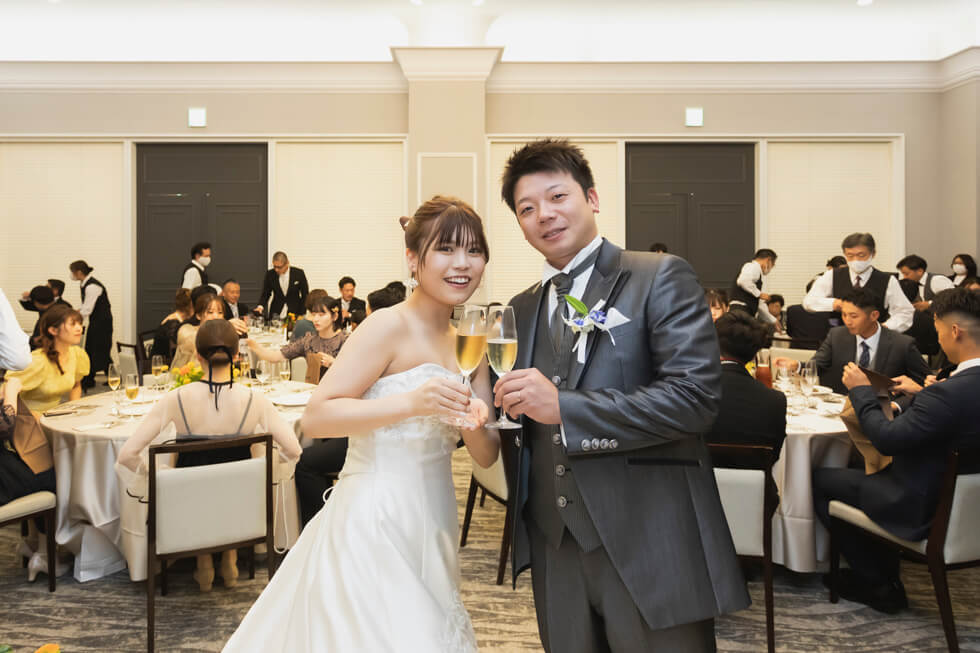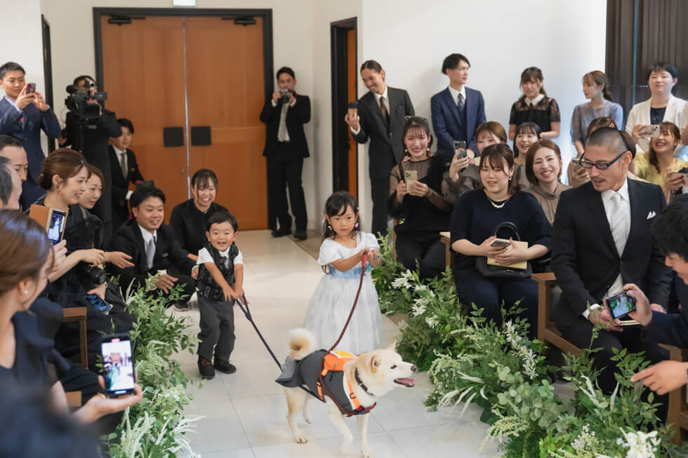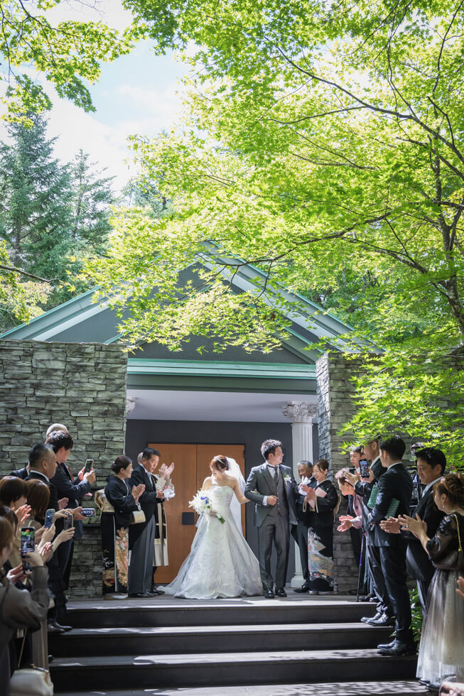 ワンちゃんもお手伝いしてくれた心温まる挙式の後は、軽井沢の原風景を残す中庭で、ゲストと今日この日を迎えられたことに乾杯。披露宴では大切なゲストの方が代表で、おふたりの祝福を祈って乾杯。結びにゲストの皆様の幸せを祈って全員で乾杯。これからも一緒に乾杯が出来るよう、親御様にはグラスを、ゲスト全員にはテーマデザインのコースターをお渡ししました。ゲストとおふたりらしさで通じ合った楽しい一日をお過ごしいただきました。